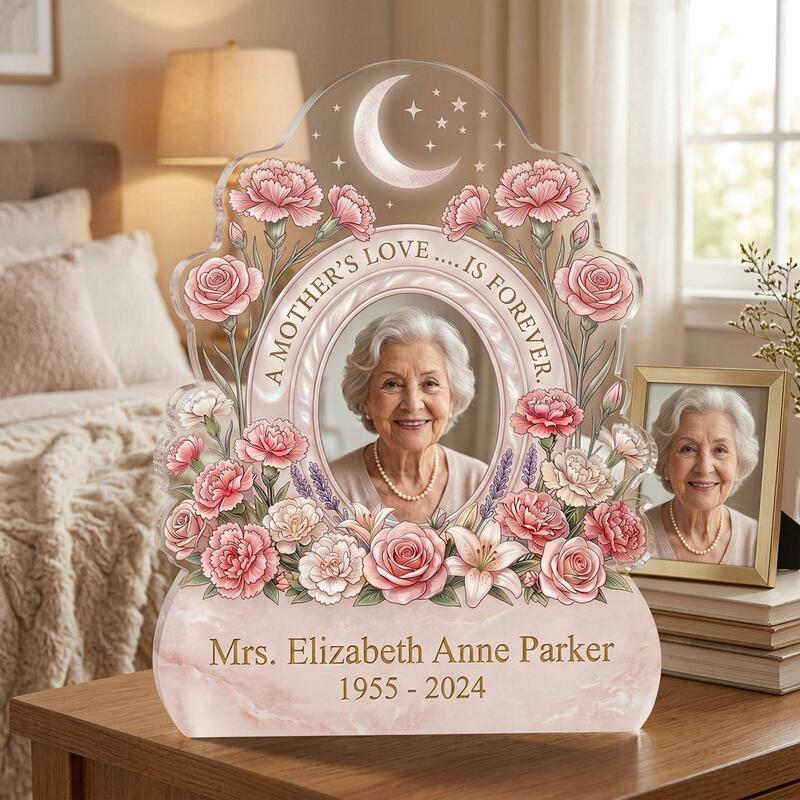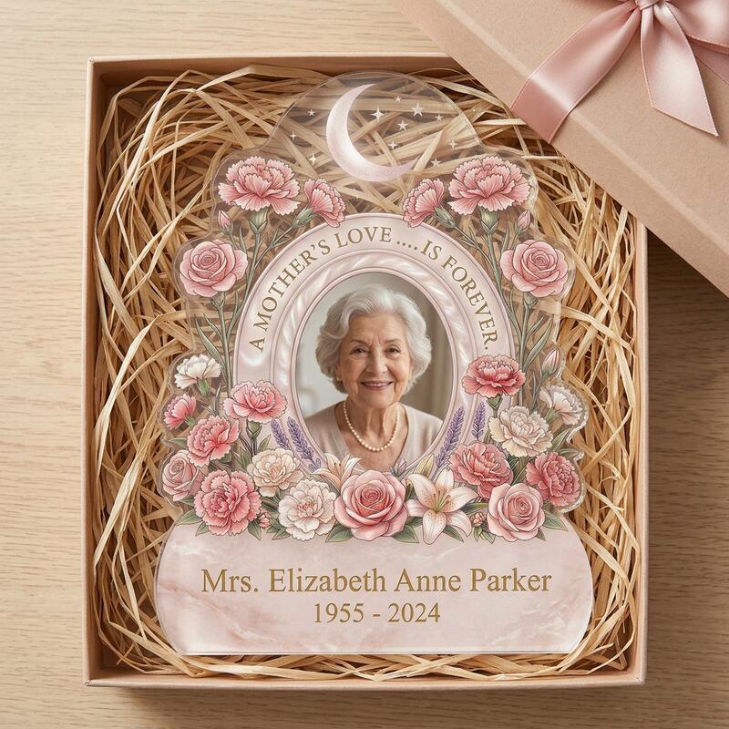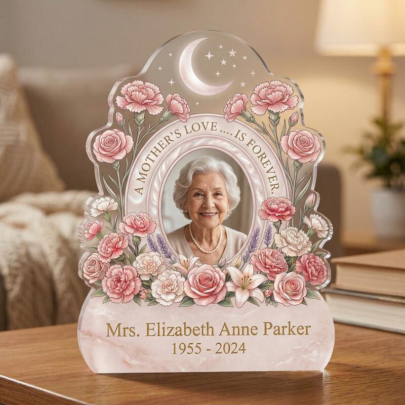 Op maat gemaakte acryl gedenkstandaard met bloemenen maanmotief gepersonaliseerd rouwherinneringscadeau met eigen foto voor mama