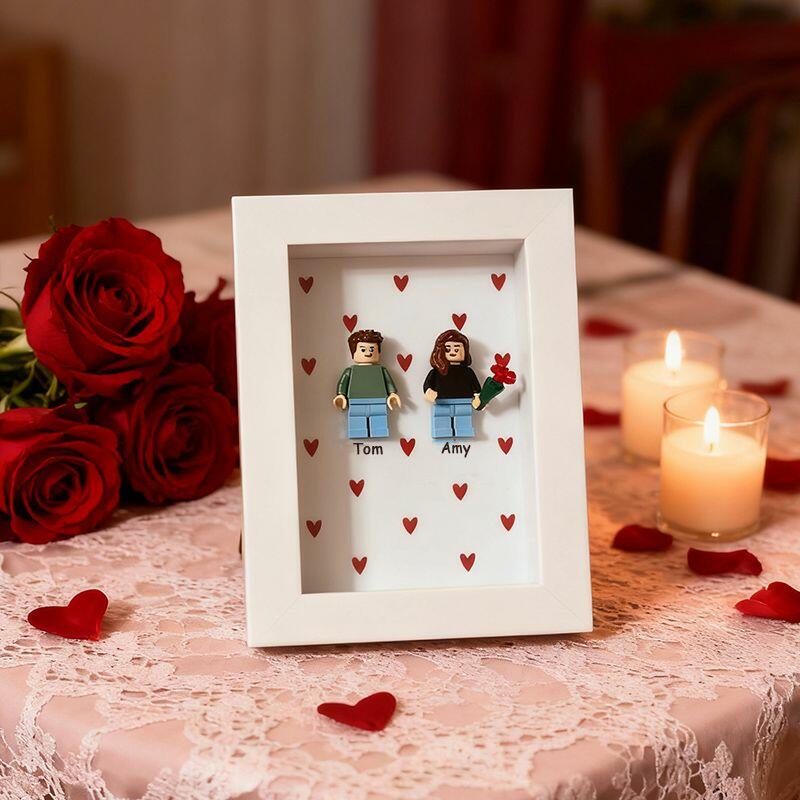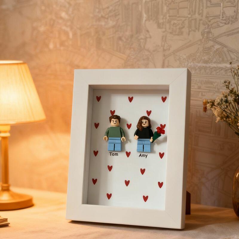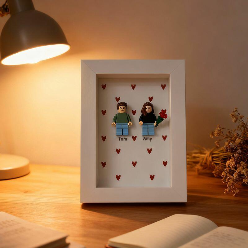 Gepersonaliseerde fotolijstjes met minifiguren van bouwstenen en hartjes Leuk cadeau voor koppels