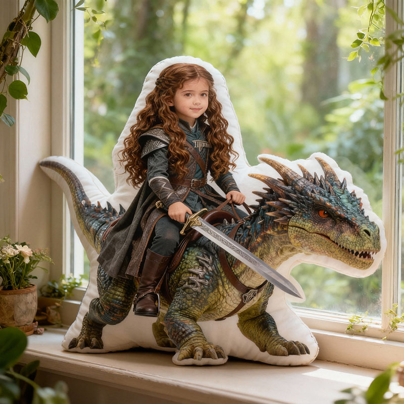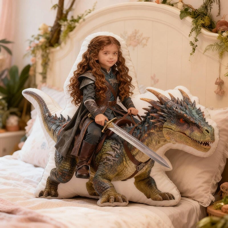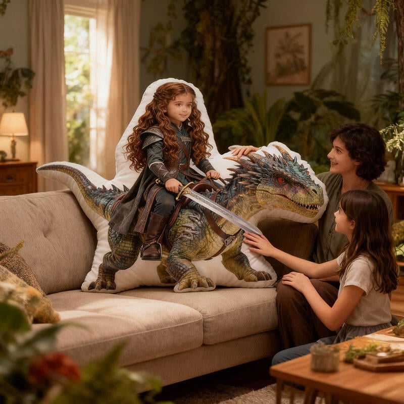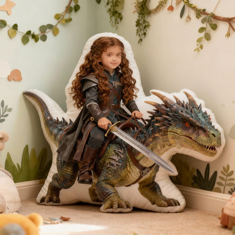 Gepersonaliseerd kussen met portret en dinosaurusontwerp Prachtig cadeau voor meisjes