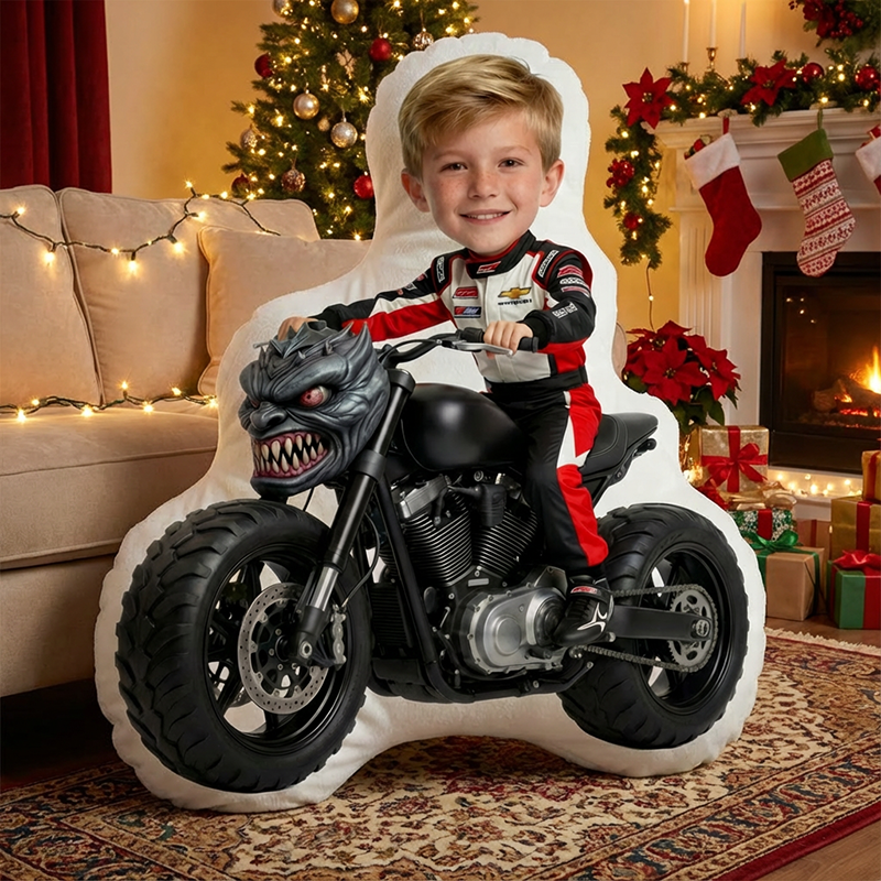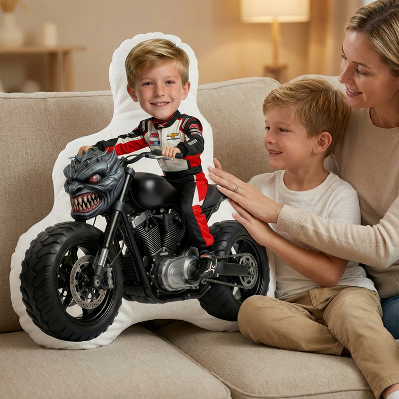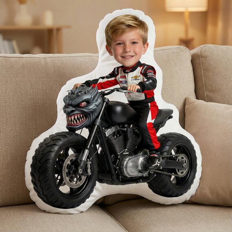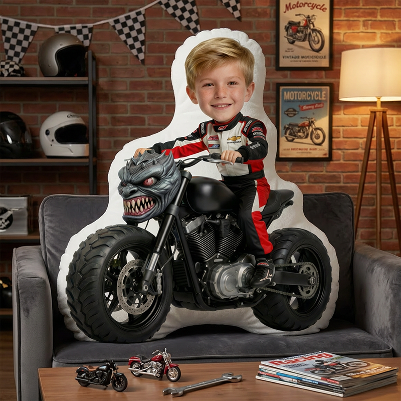 Gepersonaliseerd kussen met portret en motorpatroon Stijlvol cadeau voor kinderen