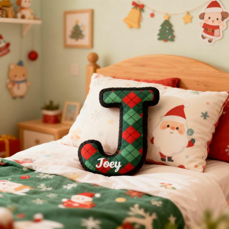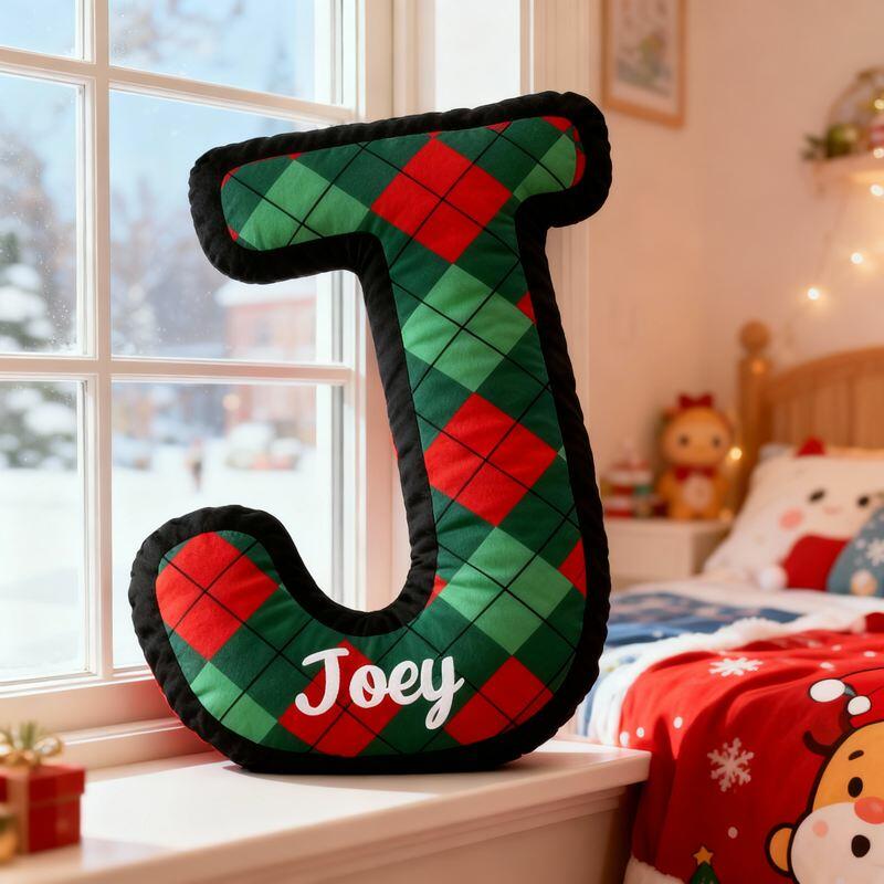 Gepersonaliseerd kussen in de vorm van een letter kerstkleuren geruit ontwerp met initialen cadeau voor kinderen