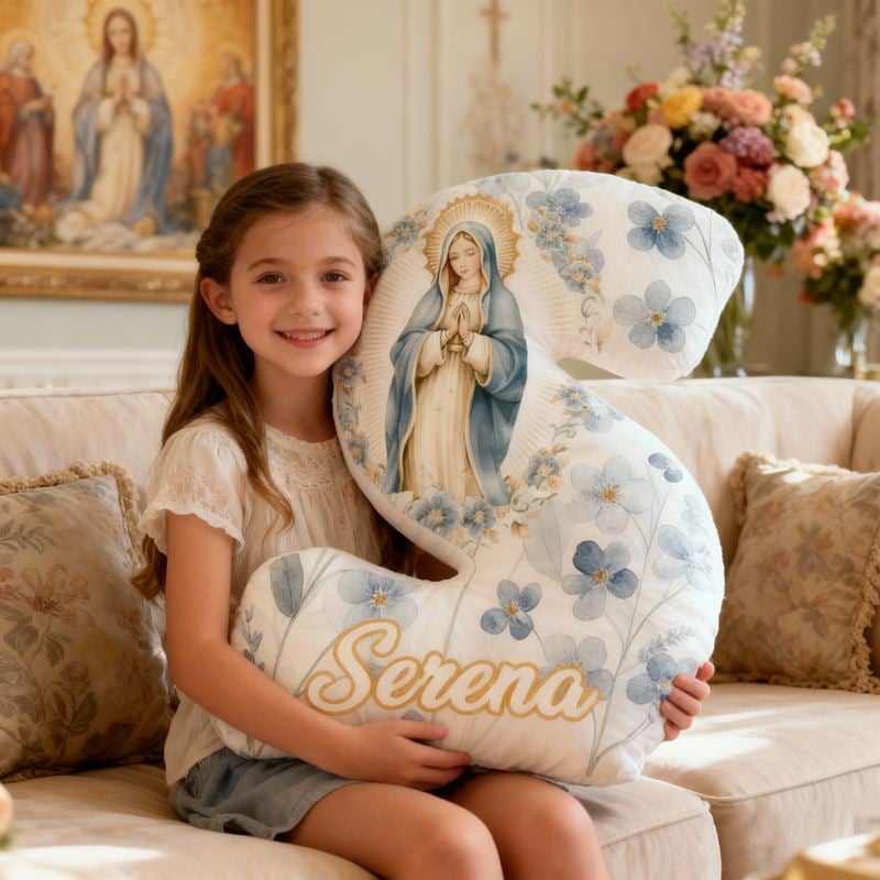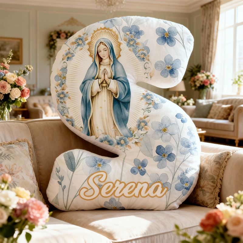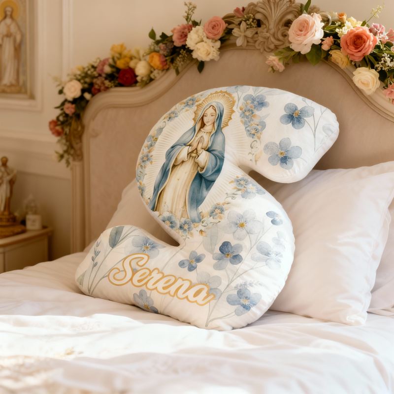 Gepersonaliseerd kussen in de vorm van een letter met een bloemmotief van het gebed van de Maagd Maria Religieus cadeau voor kinderen