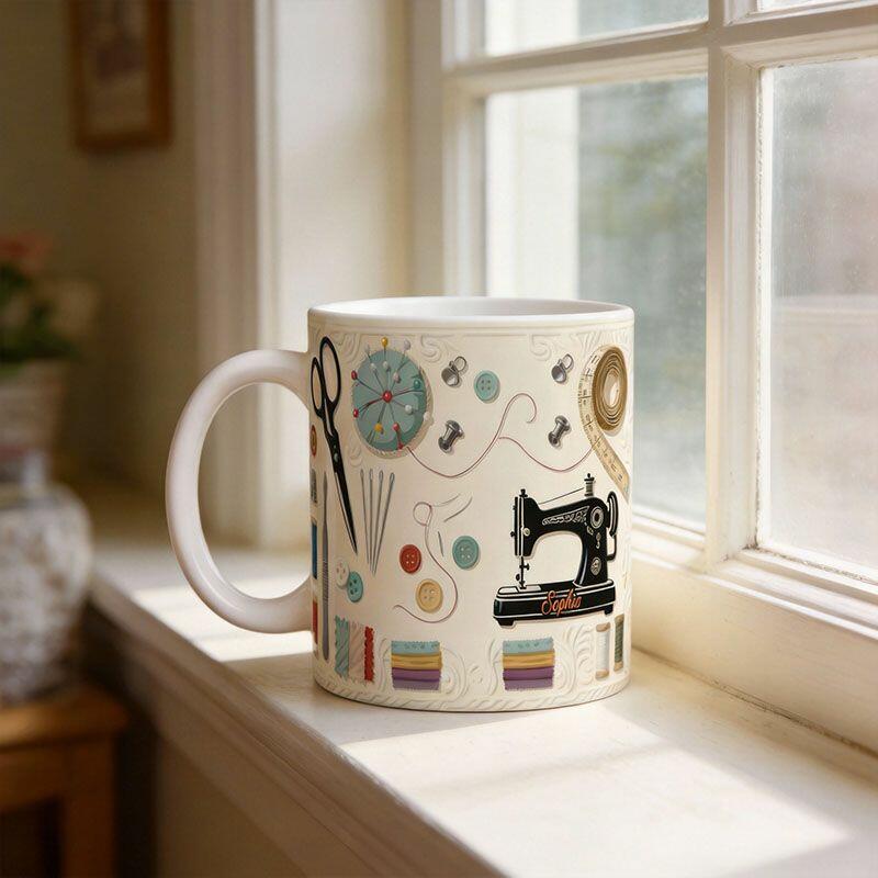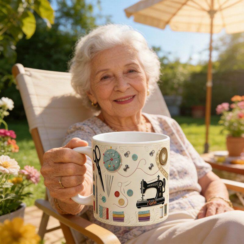 Gepersonaliseerde mok met naam en naaimachinepatroon Speciaal cadeau voor oma