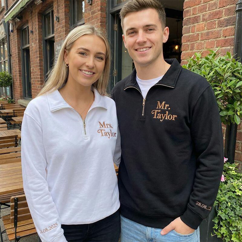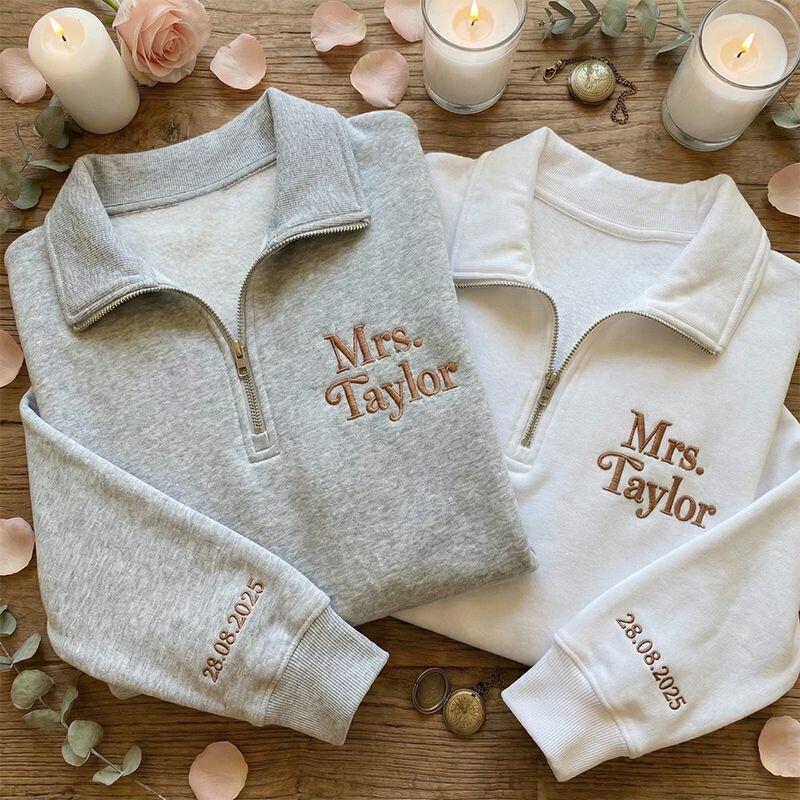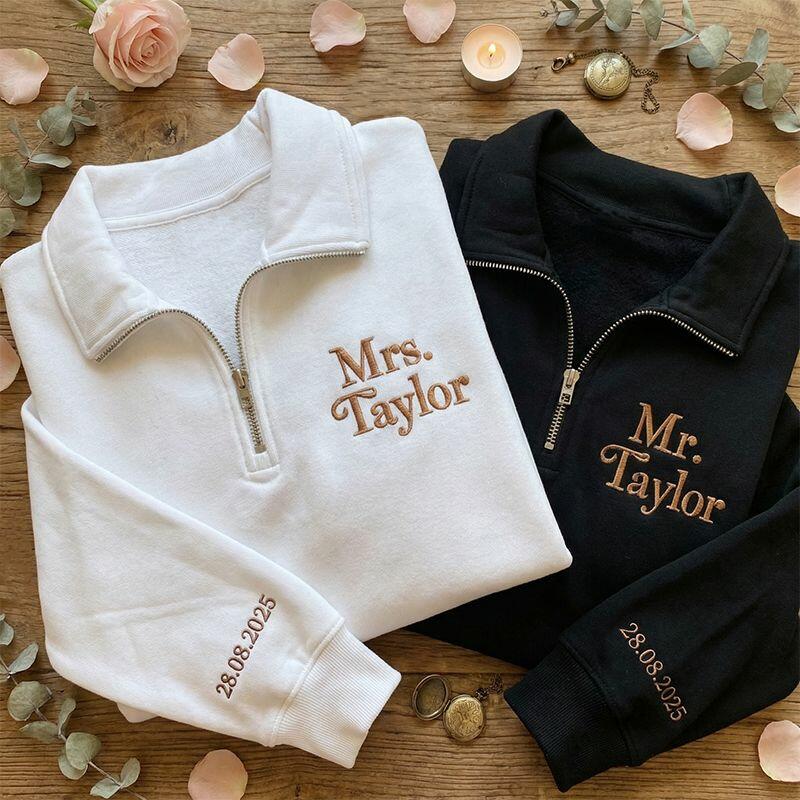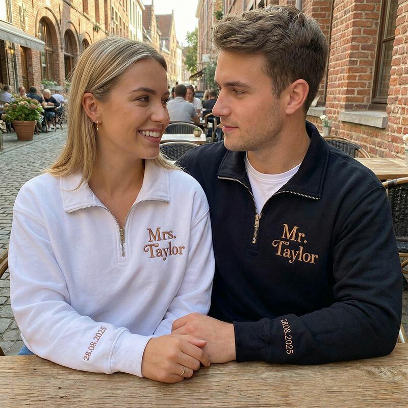 Gepersonaliseerd sweatshirt met kwartritssluiting geborduurd met de naam en datum van een stel Uniek cadeau voor een verjaardag