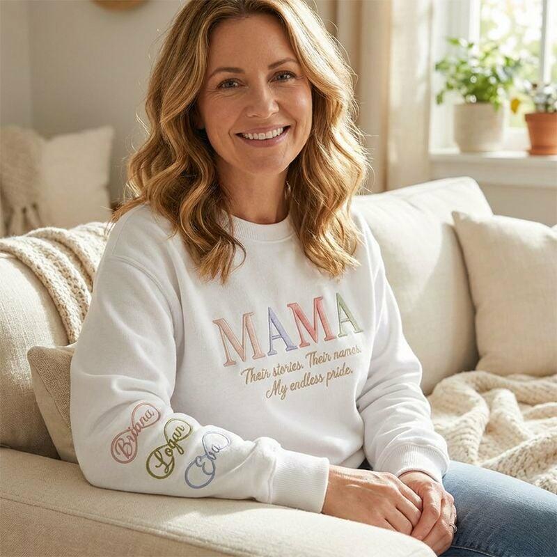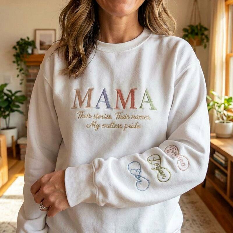 Gepersonaliseerd sweatshirt geborduurde tekst met namen van kinderen en oneindigheidsteken prachtig cadeau voor Moederdag