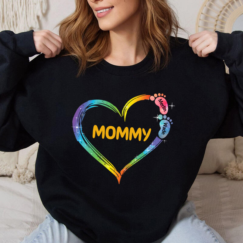 Gepersonaliseerd sweatshirt Custom Footprints Kids Name Kleurrijk hart ontwerp Aantrekkelijk Moederdag cadeau