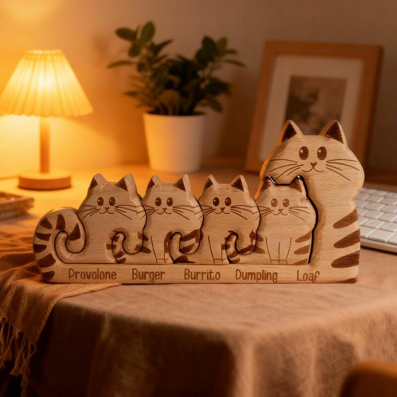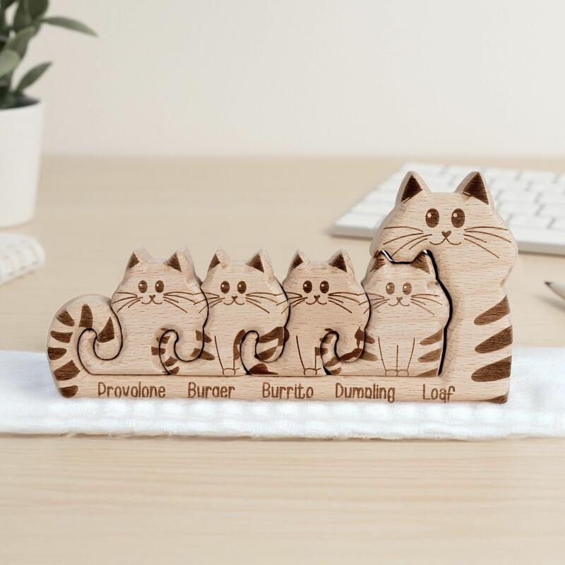 Gepersonaliseerde houten cartoonkattenfamilie-puzzel Leuk cadeau voor mama